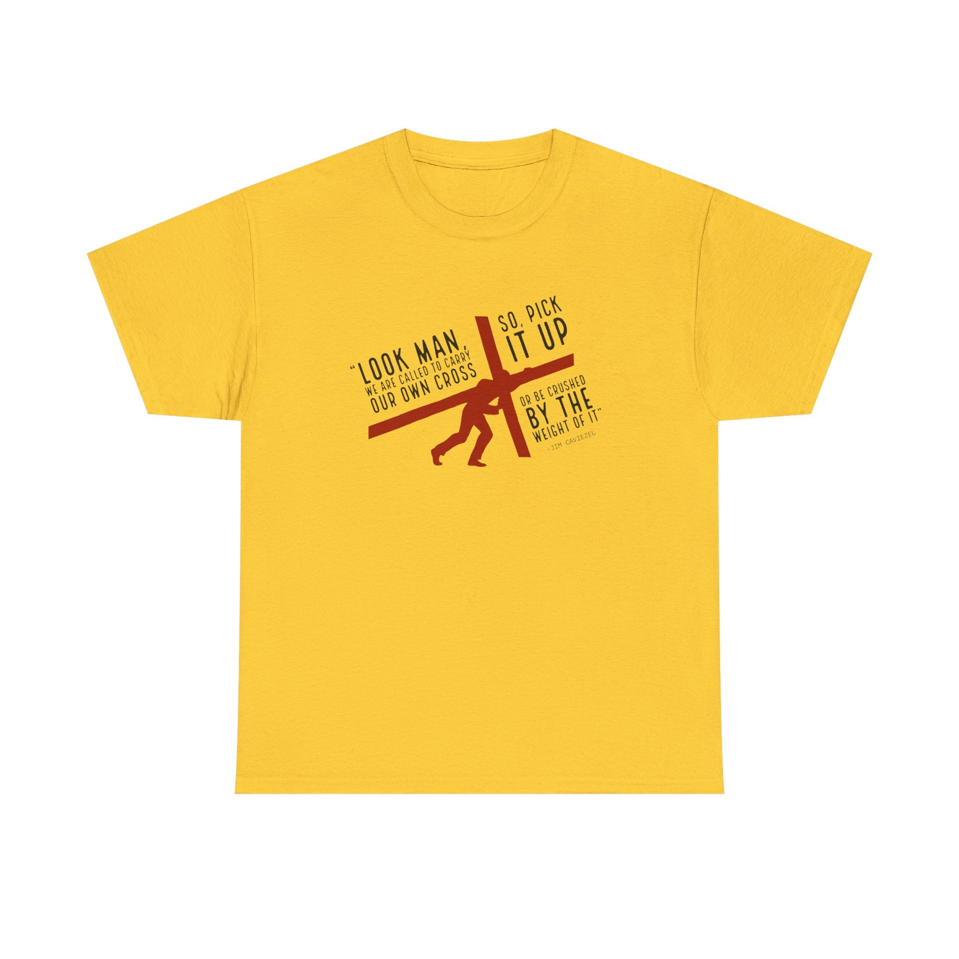 This "Be Crushed by the Weight" unisex heavy cotton tee is a statement made by Jim Caviezel when doing media for Passion. Some of the challenges he faced when being selected by Mel Gibson to play Jesus. So go ahead, pick up your own Cross, and walk the life with Christ. It is the foundation upon which Jesus-collaborated fashion grows. The specialty spun fibers provide a smooth surface for premium printing vividity and sharpness. No side seams mean there are no itchy interruptions under the arms. The shoulders have tape for improved durability.