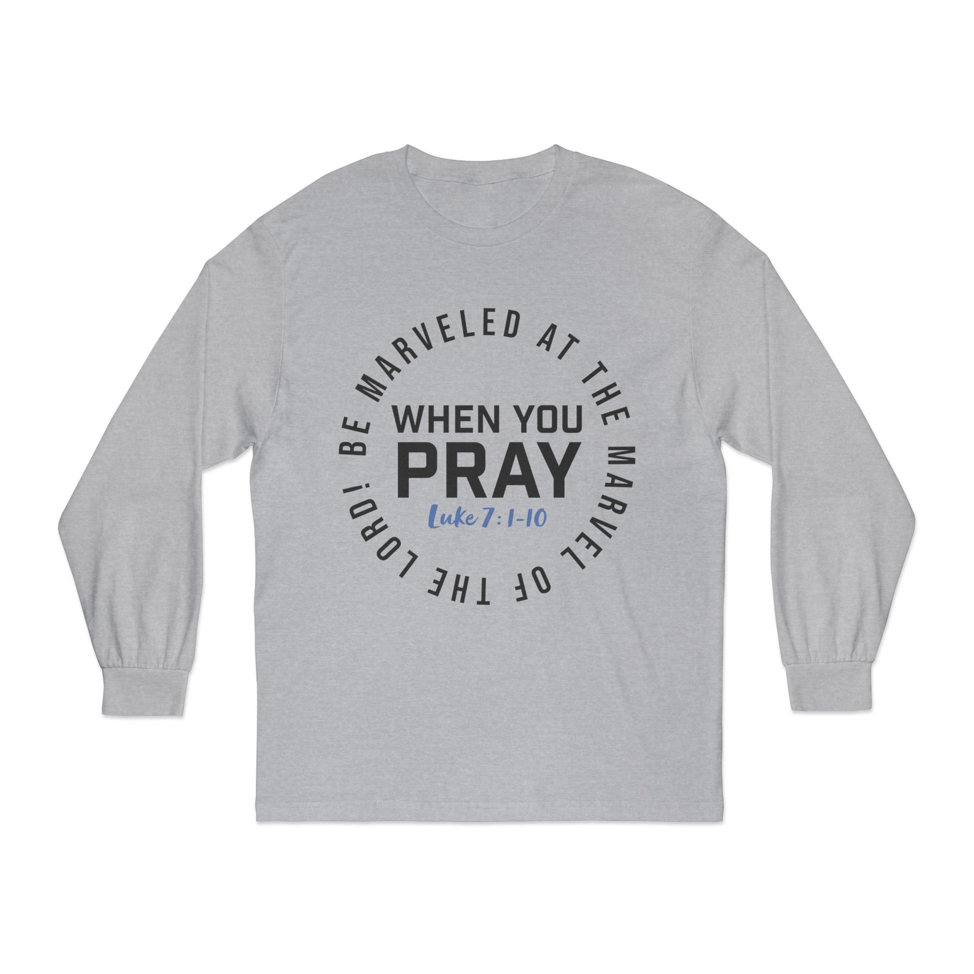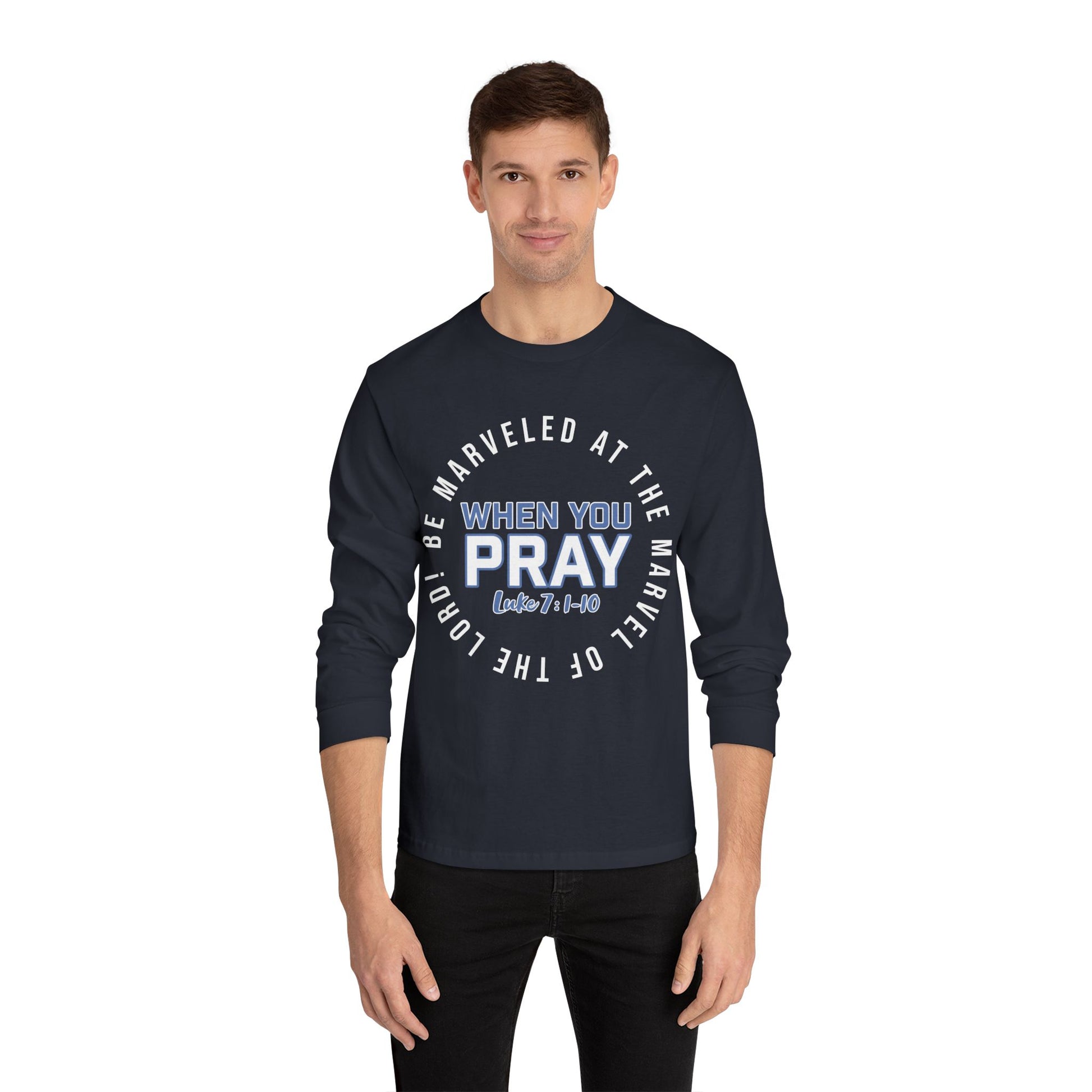 This "Be Marveled" unisex long-sleeve shirts are a highly versatile choice that stays comfy throughout the day. Design taken from the biblcal account of the Centurian who sought ater Christ to heal his servent. His faith was so measured that he amazed Jesus to the point where He said, "I have not seen a greater faith in all of Isreal." We should desire that kind of faith where God himself would be amazed, or the word we chose to use, "Marveled!" A foundational truth upon which Jesus-collaborated fashion grows. Their tubular shape provides an easy-going, classic fit that is perfect for any occasion while the ribbed cuffs help maintain the garment's good looks for longer.