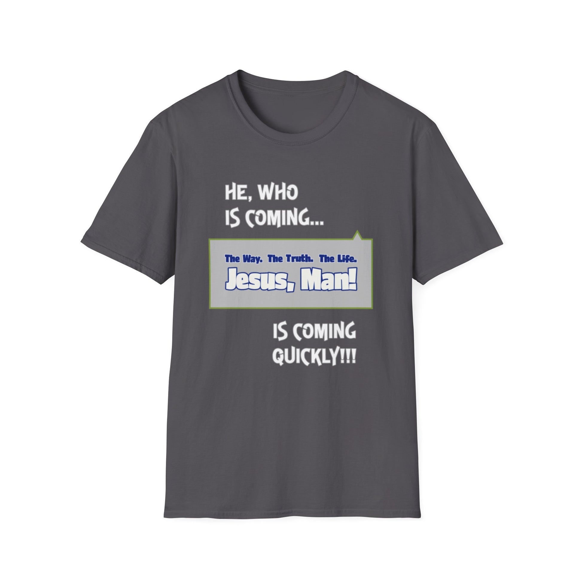 This "He, Who is Coming... unisex heavy cotton tee is the perfect add-in to any wardrobe. Foundationally sound design centering on the imminent return of Jesus. We believe he is, as Jimmy Evans who has forty some odd years of prophesy study says, "About 2 seconds to midnight." Which means he is close. Another Jesus-collaborated design that is sure to make people ponder their invitation to become a "Jesus, Man!" No side seams mean there are no itchy interruptions under the arms. The shoulders have tape for improved durability.