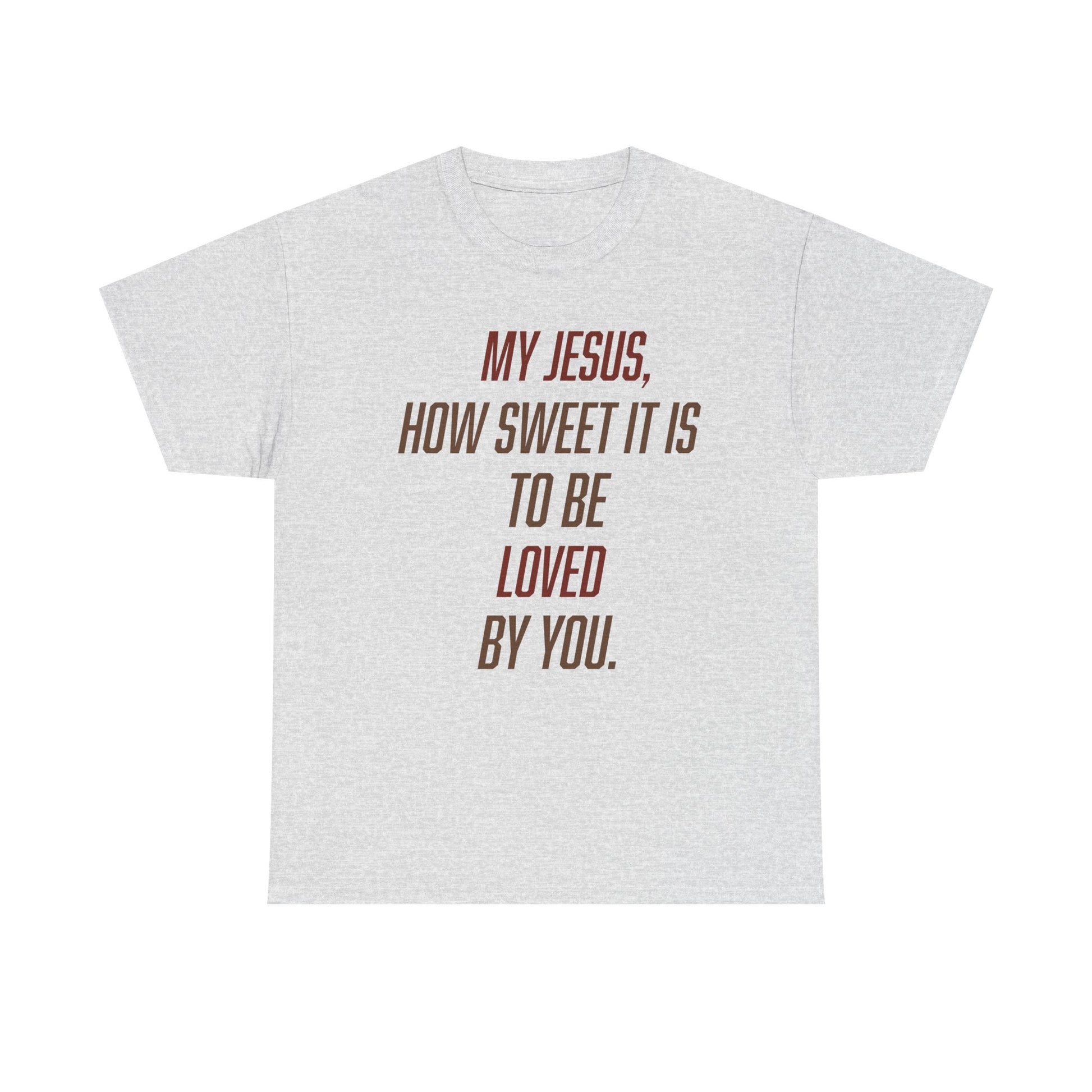 This "How Sweet It Is" unisex heavy cotton tee is a design borrowed from a chorus in the classic song by James Taylor. Listening to a tune like that while driving down the road brought a thought about the magnitude of Jesus' love. It is unlike any other, and such sweet aroma to breathe in. A classic statement that is foundational upon which Jesus-collaborated fashion grows.