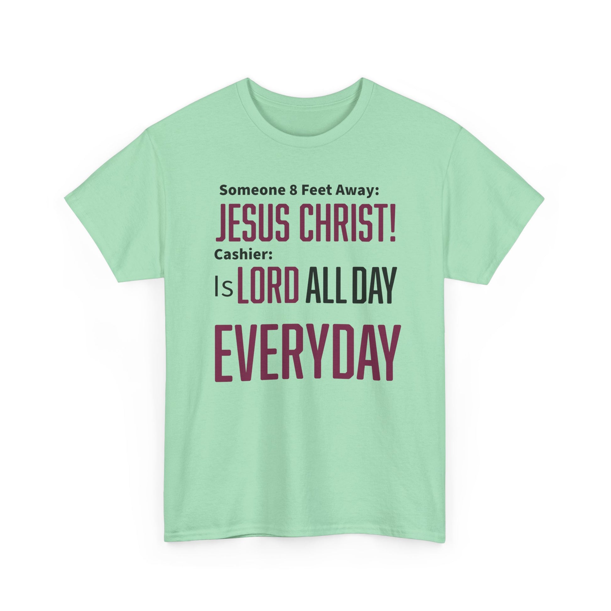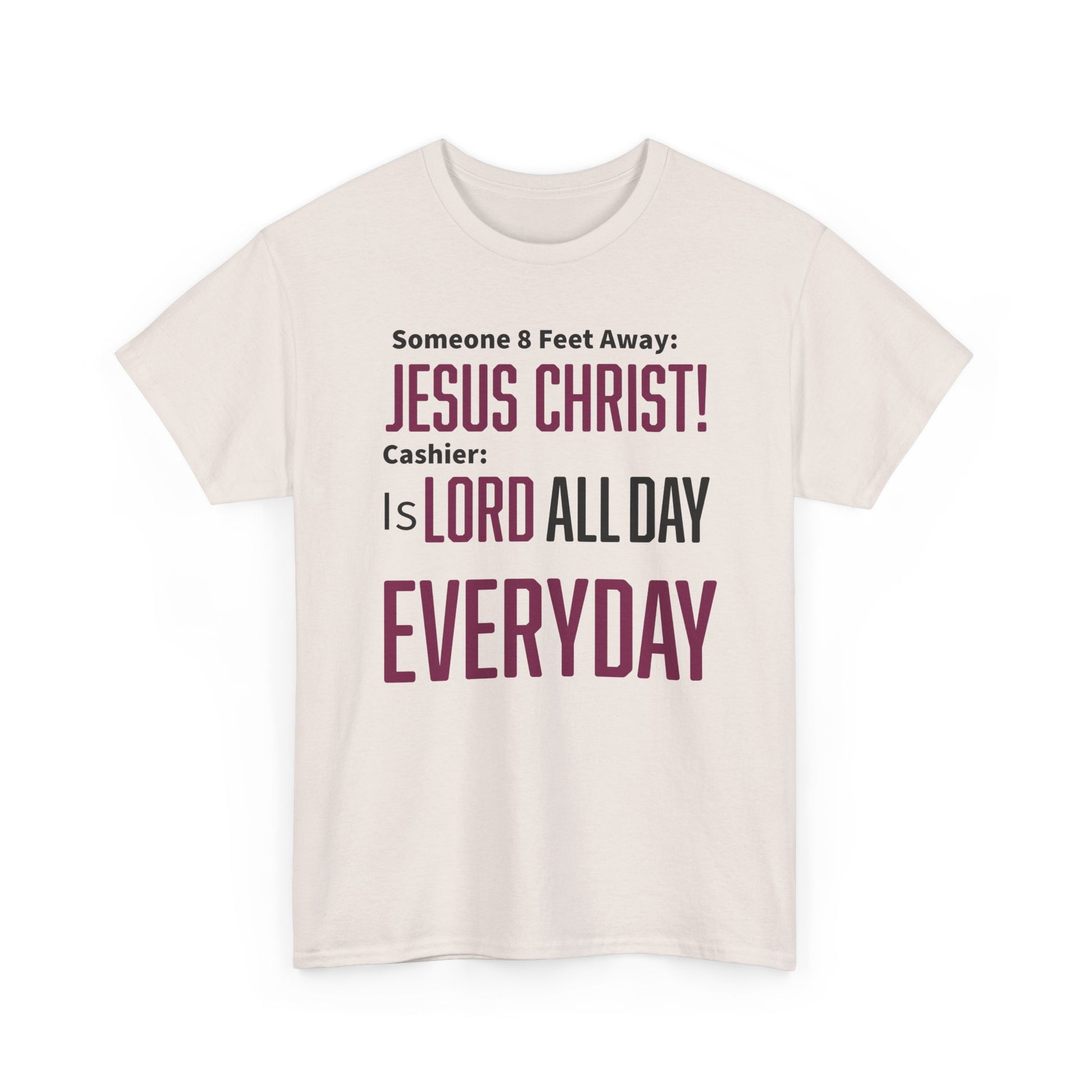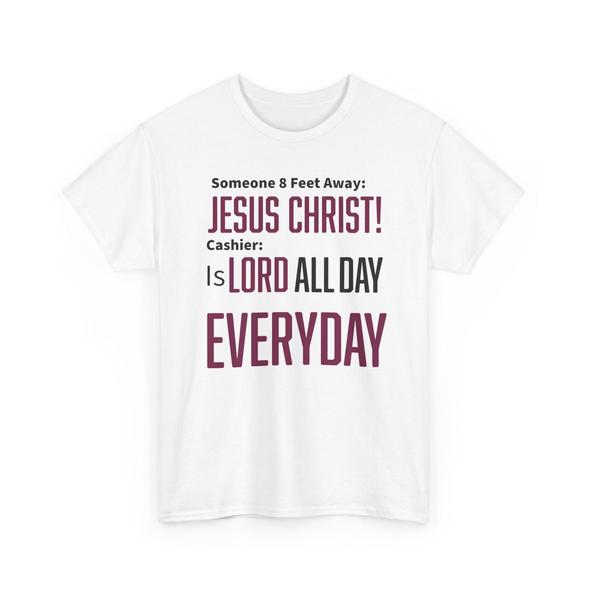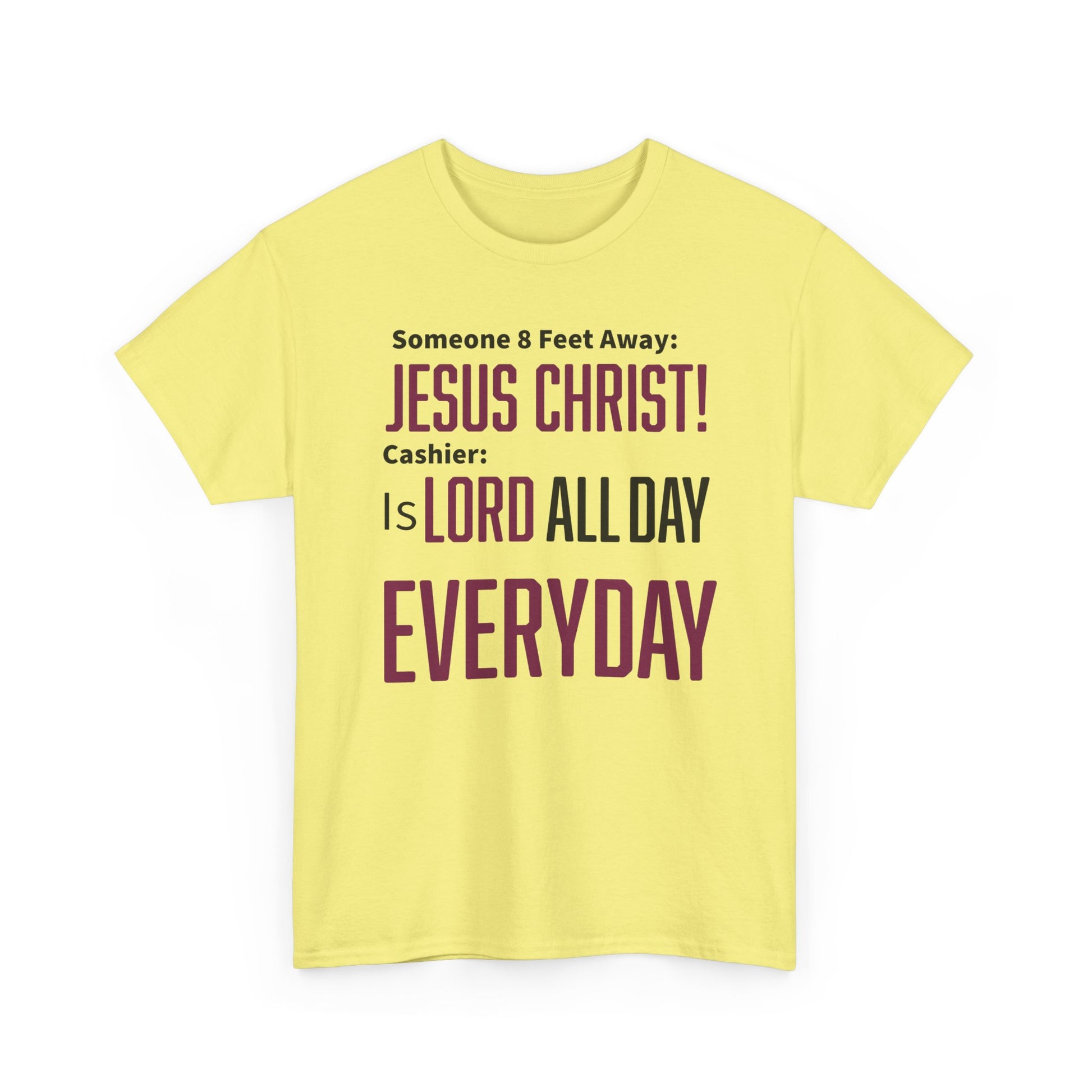 Introducing this stylish Unisex Heavy Cotton Tee, perfect for expressing your faith and sharing a message of love. The invitation design, featuring the phrase "Jesus Christ is Lord All Day Everyday," evokes a joyful and uplifting message. Design inspired by a conversation between a cashier at blue and white home improvement store and a customer who screamed. Jesus Christ!: