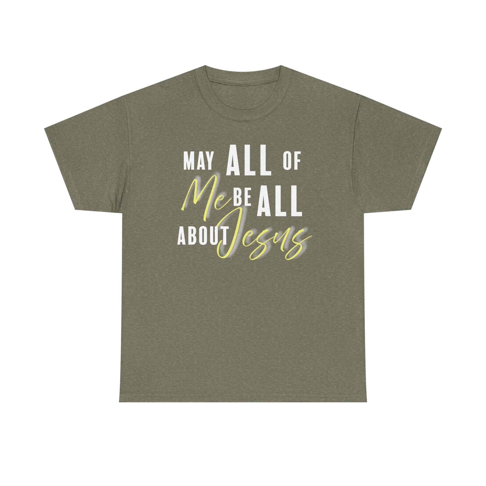 This "May All of Me"unisex heavy cotton tee is a spiritual truth statement. Mainly, it should drive the reader to jump up from where they are sitting or even if they are walking by to ask, "How are you ALL about Jesus? I want to know." It can be a basic staple of any wardrobe and a foundation upon which Jesus-collaborated fashion grows. No side seams mean there are no itchy interruptions under the arms. The shoulders have tape for improved durability.