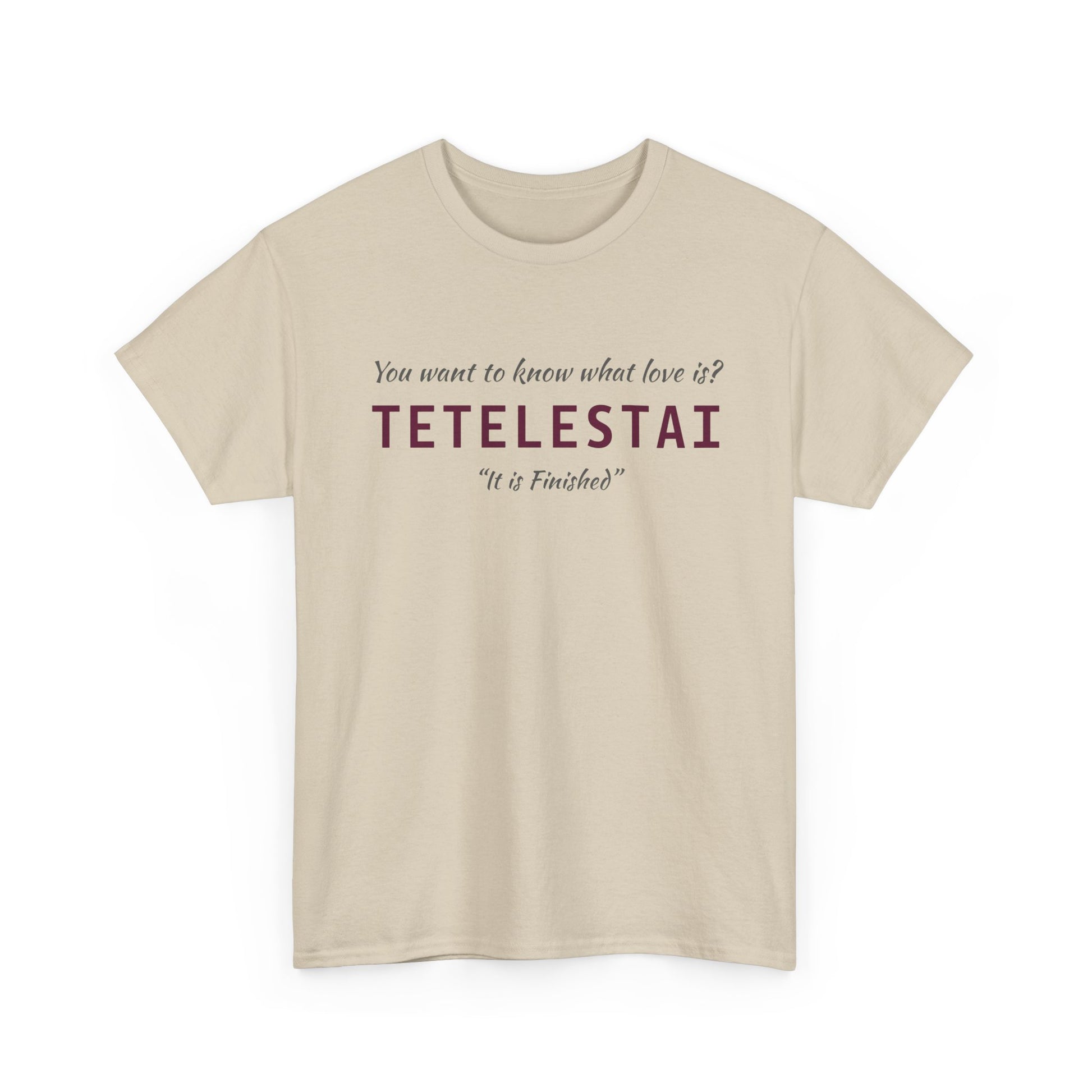 The "Tetelestai" unisex heavy cotton tee is the basic staple of any wardrobe. Design taken from a Greek word, which translates to, “It Is Finished!!!” What it comes down to is seven to eight inches of blood streaming down the Cross to finally get how much He loves us. The average adult’s amount of blood is 1.3 gallons, and Jesus exhausted every drop of it. So, you want to know what love is? You have it with one word, “Tetelestai,” This Jesus-collaborated design is meant to be a conversation stater. A foundational truth upon which fashion grows..